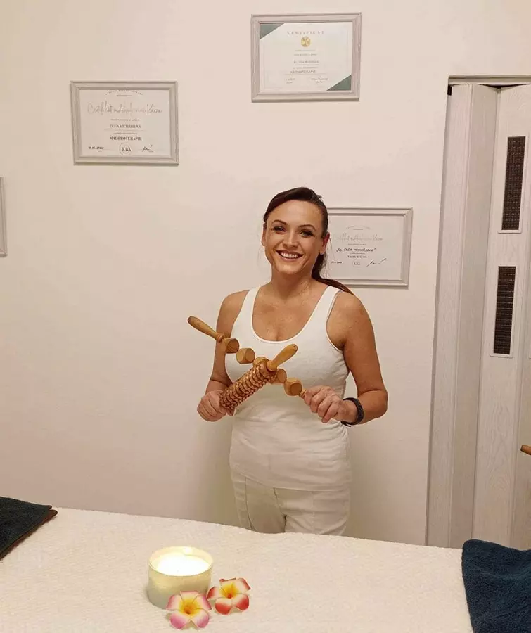 - Maderoterapie – speciální masáž dřevěnými válečky pro tvarování postavy, redukci celulitidy a podporu lymfatického systému.