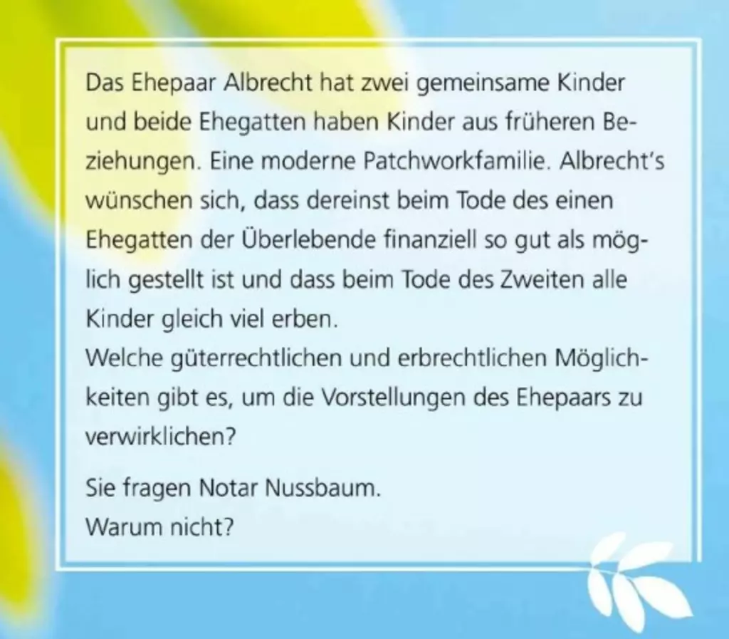 Wir sind bestrebt, Sie ganz persönlich zu beraten und Ihnen notarielle Urkunden zu empfehlen, die alle Lebensaspekte miteinbeziehen.